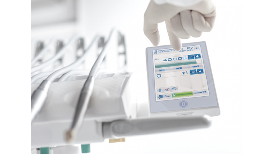 Lékařský stolek na rameni s pneumatickou brzdou. Uživatelské nastavení pro 3 + 1 lékaře s možností ukládání dat přes USB, volitelně 3 motor setupy: konzervační/endodoncie/implantologie a 3 piezo setupy: OZK/endodoncie/paro |